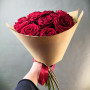 На фото букет из 13 бордовых роз. В составе: роза 13 шт, крафт-бумага 1 шт, атласная лента 1 шт, . Все цветы свежие и ароматные, букет красиво оформлен и отлично подходит для подарка. Доступна доставка цветов или самовывоз.