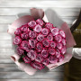 На фото букет из 33 фиолетовых роз. В составе: роза 33 шт, дизайнерская упаковка 1 шт, атласная лента 1 шт, . Все цветы свежие и ароматные, букет красиво оформлен и отлично подходит для подарка. Доступна доставка цветов или самовывоз.