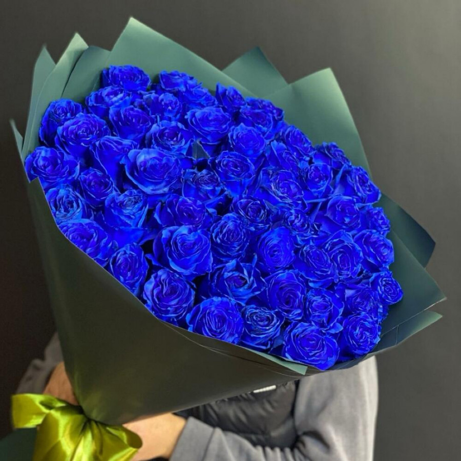 На фото 49 синих роз в дизайнерской упаковке. В составе: роза (синяя) 49 шт, дизайнерская упаковка 2 шт, атласная лента 1 шт, . Все цветы свежие и ароматные, букет красиво оформлен и отлично подходит для подарка. Доступна доставка цветов или самовывоз.
