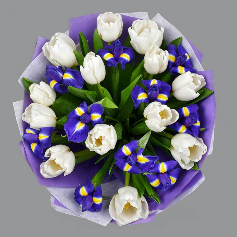 На фото букет из синих ирисов и белых тюльпанов. В составе: ирис 10 шт, тюльпан 13 шт, крафт-бумага 1 шт, атласная лента 1 шт, . Все цветы свежие и ароматные, букет красиво оформлен и отлично подходит для подарка. Доступна доставка цветов или самовывоз.