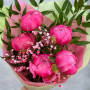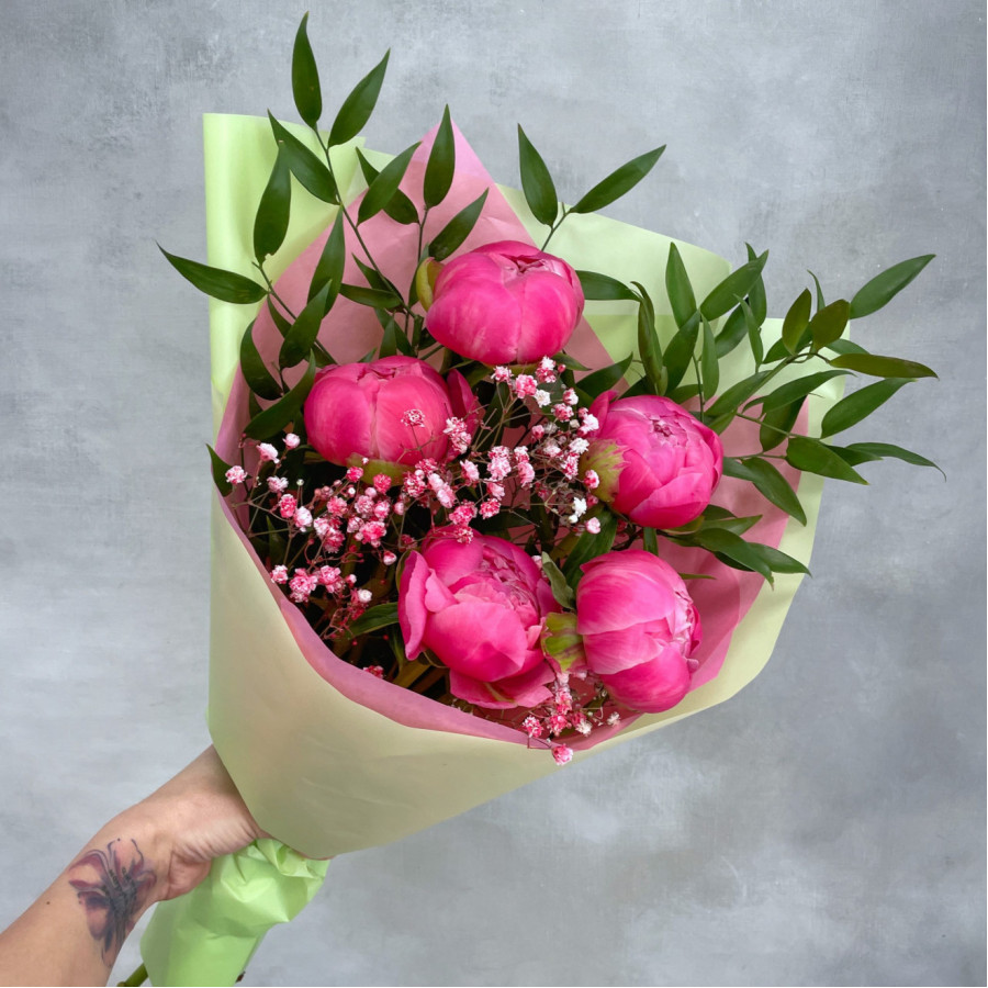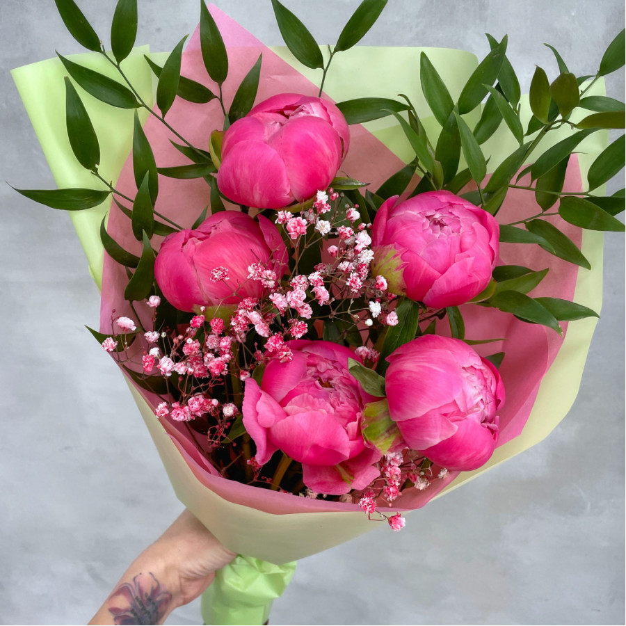 На фото букет из 5 коралловых пионов и гипсофил. В составе: пион 5 шт, гипсофила 1 шт, рускус 3 шт, крафт-бумага 1 шт, атласная лента 1 шт, . Все цветы свежие и ароматные, букет красиво оформлен и отлично подходит для подарка. Доступна доставка цветов или самовывоз.