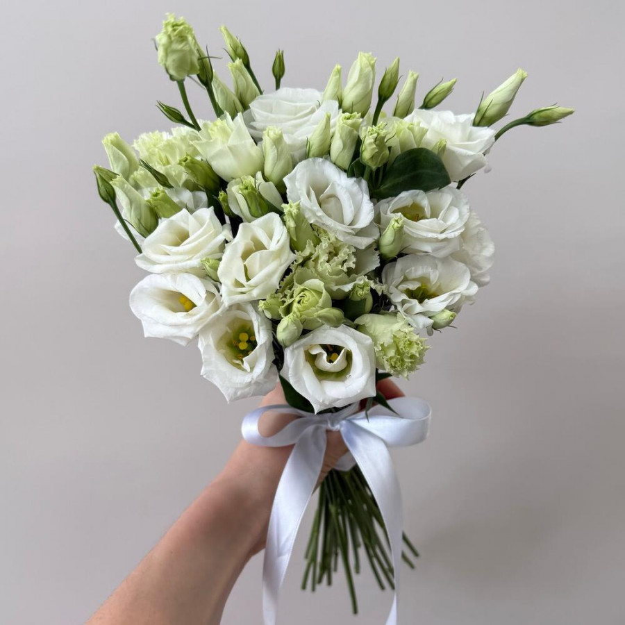 На фото букет из белых эустом для невесты. В составе: эустома (лизиантус) 5 шт, атласная лента 2 шт, . Все цветы свежие и ароматные, букет красиво оформлен и отлично подходит для подарка. Доступна доставка цветов или самовывоз.