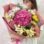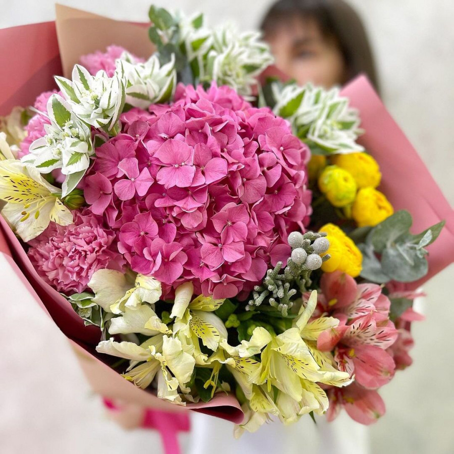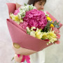 На фото букет из гортензии и альстромерий. В составе: гортензия 1 шт, альстромерия 5 шт, гвоздика 3 шт, кустовая пионовидная роза 1 шт, бруния 2 шт, эвкалипт 2 шт, крафт-бумага 1 шт, атласная лента 1 шт, . Все цветы свежие и ароматные, букет красиво оформлен и отлично подходит для подарка. Доступна доставка цветов или самовывоз.