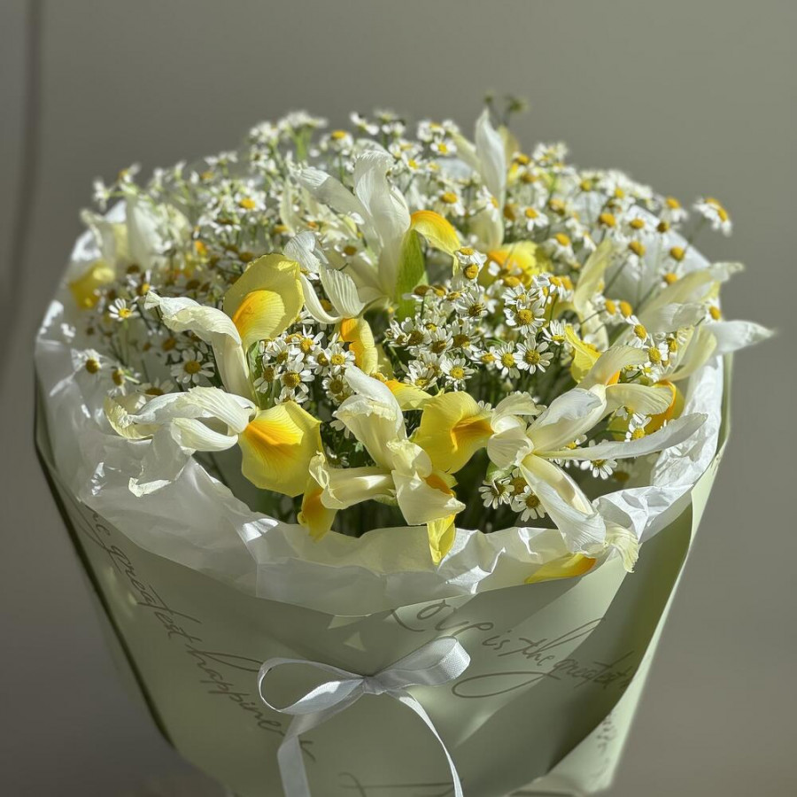 На фото букет из желтых ирисов и ромашек. В составе: ирис 7 шт, танацетум 10 шт, дизайнерская упаковка 2 шт, атласная лента 2 шт, . Все цветы свежие и ароматные, букет красиво оформлен и отлично подходит для подарка. Доступна доставка цветов или самовывоз.