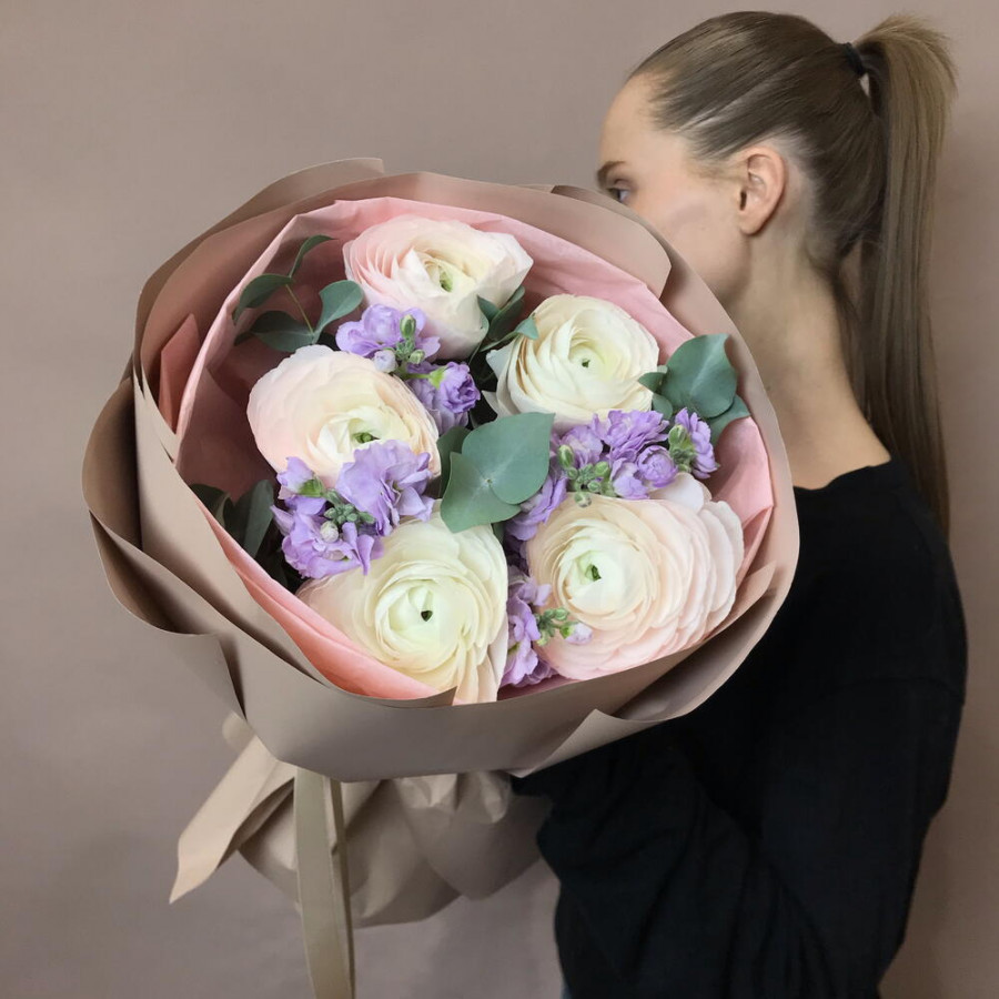 Букет из розовых ранункулюсов и сиреневой матиолы в Волжском
