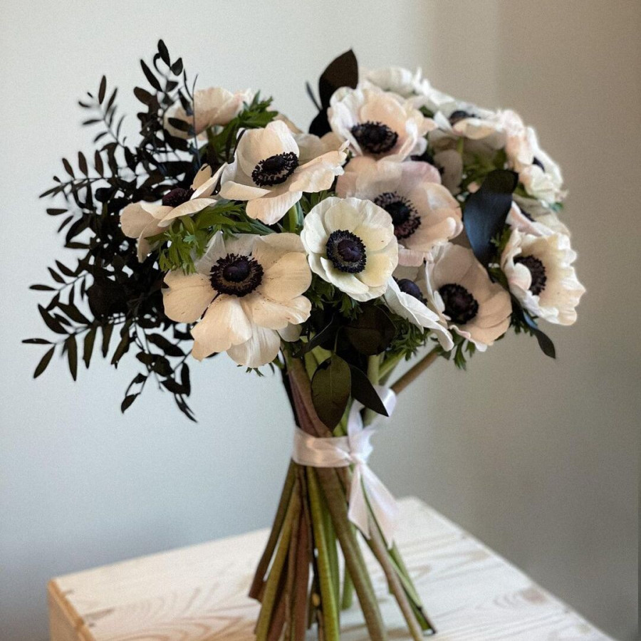 На фото свадебный букет из анемонов. В составе: анемон 17 шт, писташ 5 шт, эвкалипт 2 шт, атласная лента 1 шт, . Все цветы свежие и ароматные, букет красиво оформлен и отлично подходит для подарка. Доступна доставка цветов или самовывоз.